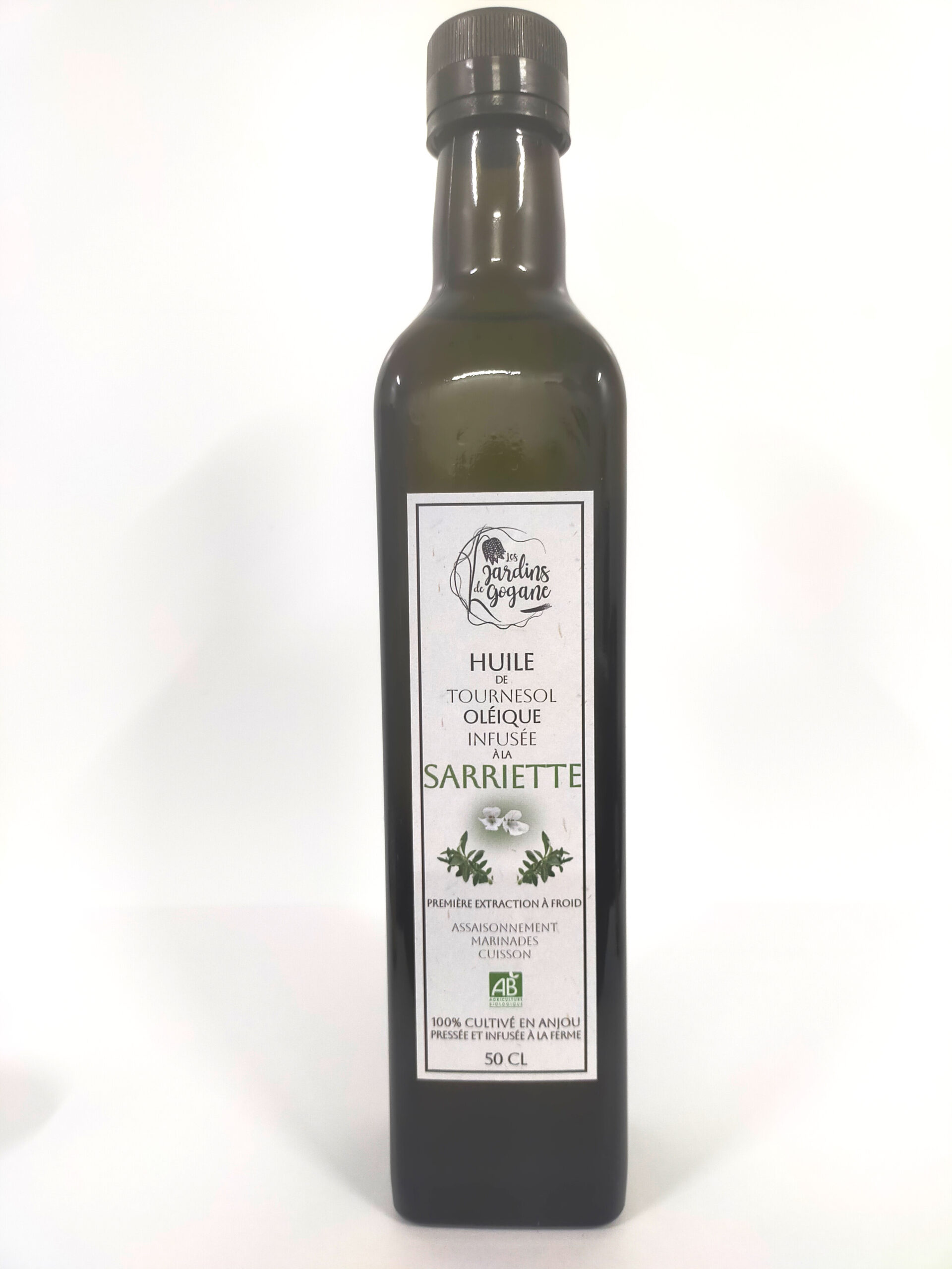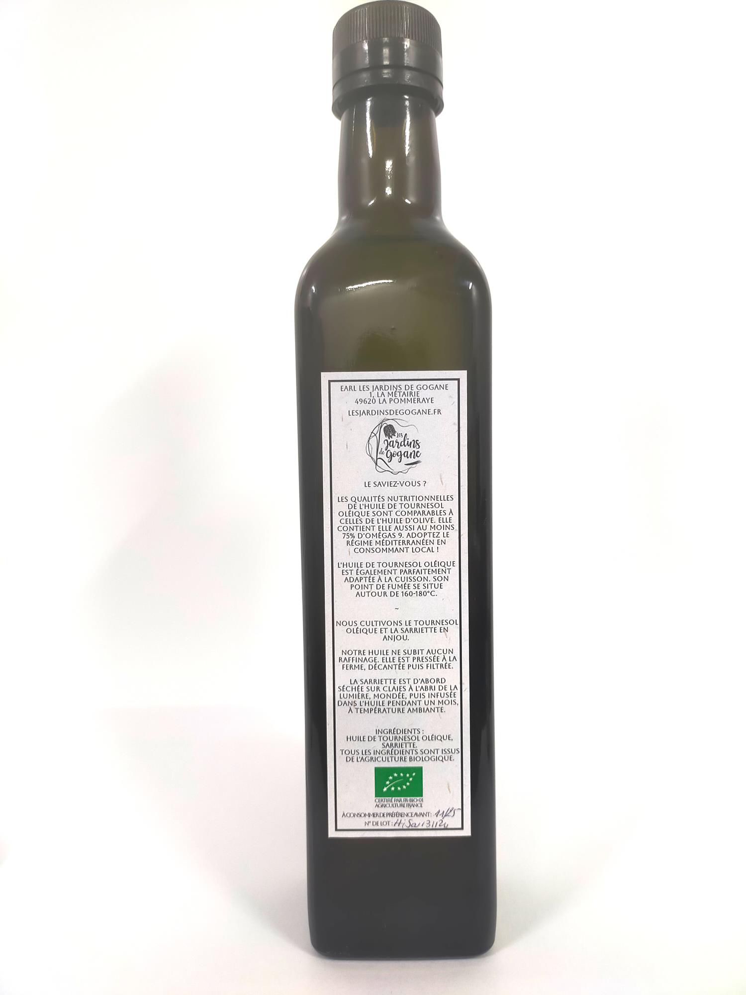 Commandes / Les jardins de Gogane / Huile infusée à la Sarriette – 50 cl Huile infusée à la Sarriette – 50 cl12,00 € la bouteille Huile de tournesol oléique infusée à la Sarriette. Convient à la cuisson ! Rupture de stock